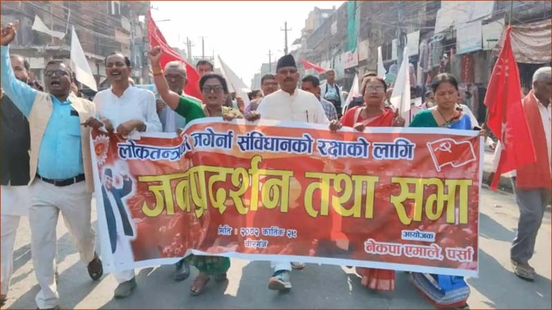 वीरगंज । नेकपा एमालेले जेनजी आन्दोलनबाट स्थापित सरकारले संविधान विपरीत शासन गरिरहेको आरोप लगाउँदै संसद् पुनस्र्थापनाको मागसहित शनिवार वीरगंजमा प्रदर्शन गरेको छ। देशव्यापी विरोध कार्यक्रमअन्तर्गत वीरगंजमा गरिएको प्रदर्शन बिपी उद्यानको रातो बंगला परिसरबाट र्यालीका रूपमा सुरु भई नगरपरिक्रमापछि घण्टाघरमा आएर सभामा परिणत भएको थियो।